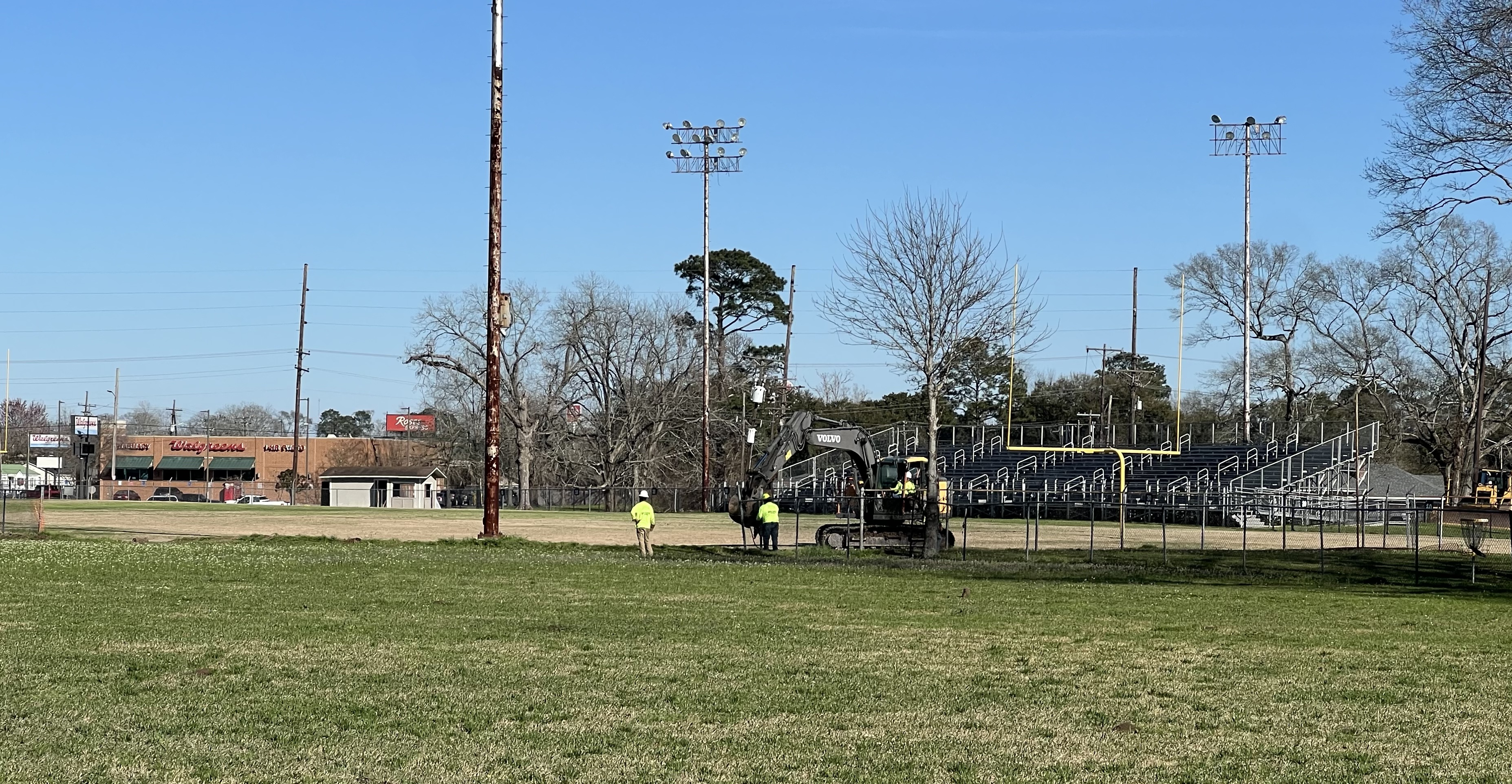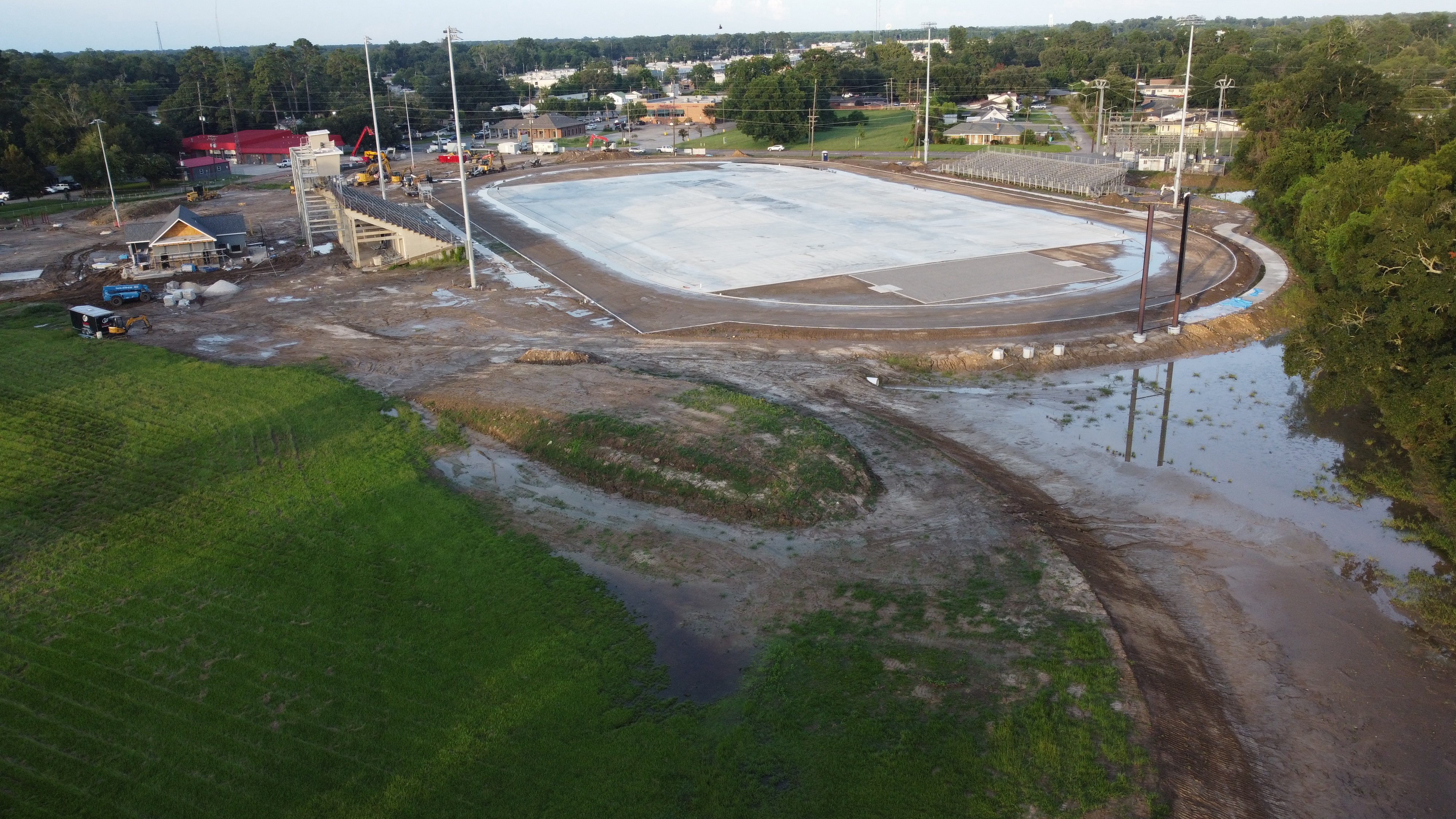 Construction at Gardner Stadium in Opelousas, a facility that serves two of the city’s five (!) high schools. The largest non-infrastructure public investment in the city’s history, estimated to cost more than $10 million. As seen on March 10, 2025