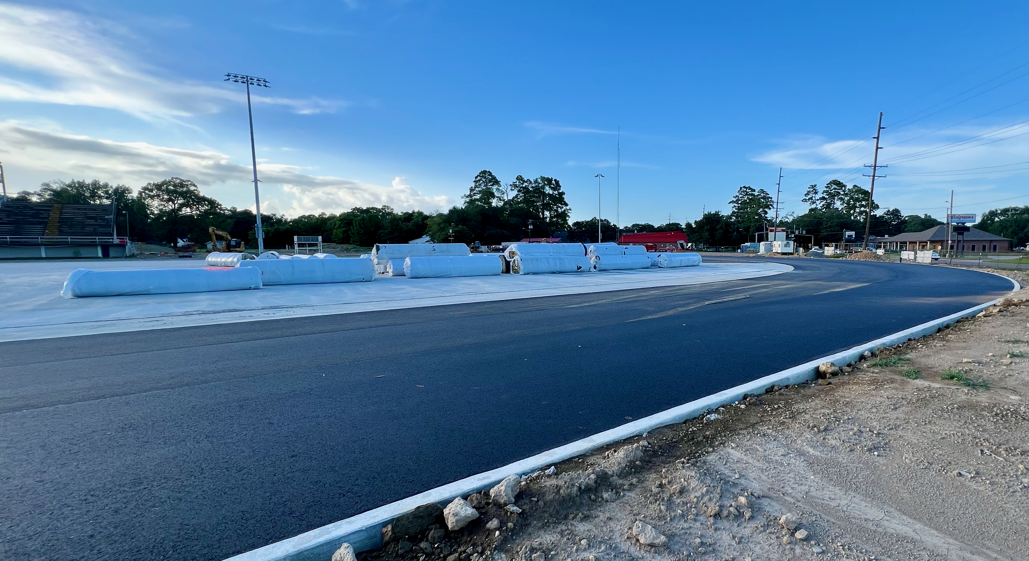 Black asphalt running track and rolls of plastic “turf” ready to be installed at Donald Gardner Stadium, July 27, 2025.